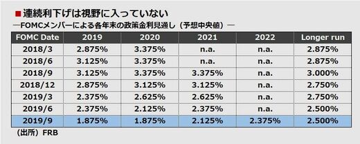 一方、日銀会合の前日に行われたFOMC(米連邦公開市場委員会)からは今後が非常に読みづらくなってきた。マイナス0.25%ポイントの利下げ(誘導目標「2.00~2.25%」→「1.75~2.00%」)は想定どおり。これに対するトランプ米大統領の悪態、「パウエルは臆病者」といったツイートなども予想どおりの反応だった。だが、政策メンバーの金利見通し、いわゆドットチャートはかなり割れてしまった。