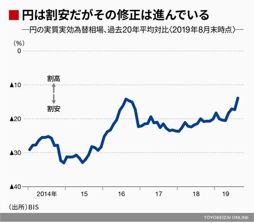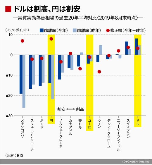 筆者は、為替市場の全体感を把握するにあたってBIS(国際決済銀行)が月次で公表する実質実効為替相場(多通貨に対する相対的な実力を物価の影響を除いて見たもの)の動きを定期的にチェックしている。具体的には各通貨の実質実効レートの長期平均(20年平均)と当該月の水準を比較した上でその乖離率に着目し、今後の修正余地や方向感の勘所としている。