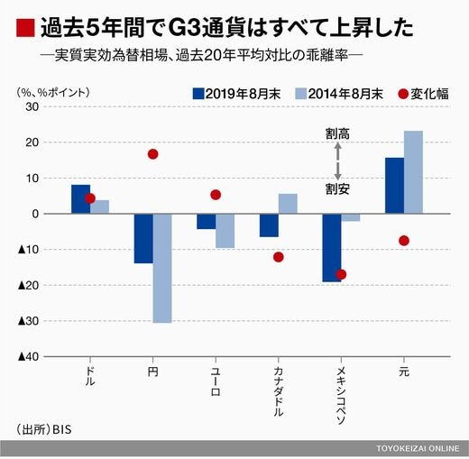 当然、この裏側ではその他通貨が下落している。例えばドルの実質実効レートを考察する上で大きなシェアを占めるカナダドルやメキシコペソ、そして人民元などは5年前からマイナス7%~マイナス17%ポイント程度、割安方向に幅を拡大させていることがわかる。