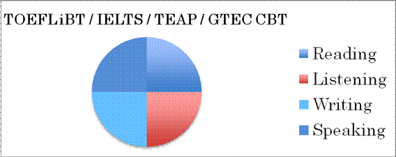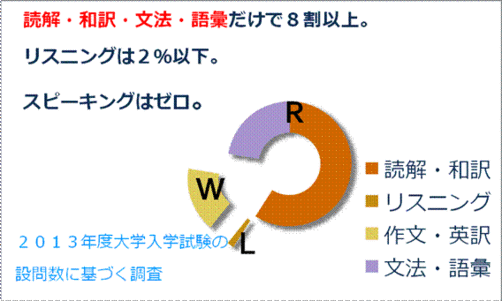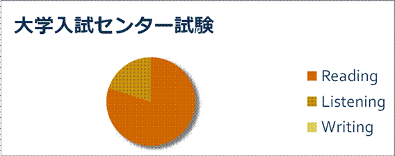 センター試験の設問自体はよく練られた良問です。また、使われている英語のレベルも適切だと思います。しかし、得点のバランスやリスニングのナレーションが2回も流されるという仕組みも適切なのか否かという議論があります。センター試験だけではなく、私大の一般入試や国立大の2次試験もリーディングへの偏りや、指導要領にそぐわない従来型の和訳問題など、日本語を多用した設問が多く含まれていることが問題視されています。一部の大学はリスニングやライティングの比率を高め、バランスのよい問題を作成しています。しかし、残念ながら入試全体としてのバランスは以下のグラフの通りです。
