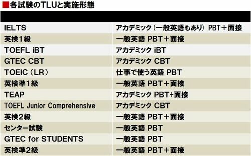 大学入試の選抜試験の代替候補としては、試験の性質から、TOEFL、IELTS、TEAP、GTECなど、TLUがアカデミックな英語とされているものが最もふさわしいといえます。次いで英検のような一般的言語使用領域をTLUとするものがふさわしいでしょう。職場での英語をTLUとするTOEICは、大学入試には向いていないということになります。もちろん、ビジネスパーソンの英語能力判定には、TOEICが向いているということになります。