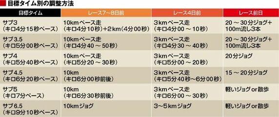サブ3(3時間切り)から完走目標のランナーまで、基本的な考え方は同じだ。レース1週間前(土曜日or日曜日)に中ぐらいの刺激を、レース4日前(水曜日)に小さな刺激を入れる。トップランナーのように序盤からハイペースで走るわけではないので、レース前日は軽くカラダを動かす程度で十分だ。くれぐれも、走り過ぎないように注意したい。