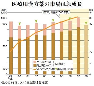 その医療用漢方薬市場で、8割超のシェアを握るのがツムラだ。2009年3月期は、家庭用品事業の譲渡で減収を余儀なくされつつも、主力の漢方薬が利益を伸ばしてしっかり増益。来期もさらに収益拡大が見込まれる。参入障壁が高い市場ゆえ競合の脅威もなし。このご時世に、わが世の春を謳歌する数少ない企業の一つである。