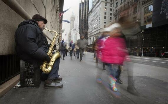 2月13日、1月米小売売上高は予想に反し前月比で0.4%減少した。写真はニューヨークの街を歩く買い物客ら。2013年12月撮影(2014年 ロイター/Carlo Allegri)