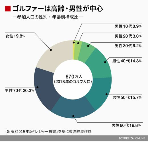 法人の接待需要に支えられて成長した日本のゴルフ産業はバブル末期の1991年にピークを迎え、足元では半分以下まで縮小してしまった。ゴルフ人口も右肩下がりだ。長く続いた経済低迷や価値観の多様化もあり、新たにゴルフを始める若者が増えない中、日本のゴルファーの約6割は50歳以上の高齢男性だ。中でも70代が20%を占める(下グラフ)。
