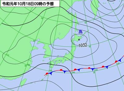 18日(金)は前線が次第に日本付近に北上し、19日(土)には前線上に低気圧が発生して北東に進む見込みです。