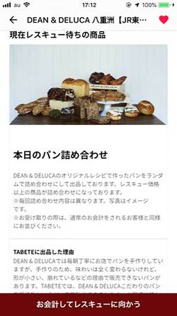流れとしては以下のとおり。店舗でロスが発生しそうになると、写真やレスキュー価格といった情報をTABETEに掲載する。すると会員に通知され、マッチングが成立すればカードなどの事前決済が行われる。後は会員が店に取りに行くだけだ。
