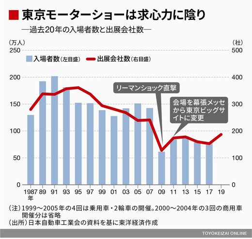 対する東京モーターショーの今年の出展社数は187社で、業界関係者も来場するが、どちらかといえば一般向けの性格が強い。バブル絶頂の1991年には史上最高の200万人を超えたが、国内の新車販売の縮小に伴って集客力が失われてきた。前回の2017年には77万人まで落ち込んだ(下図)。