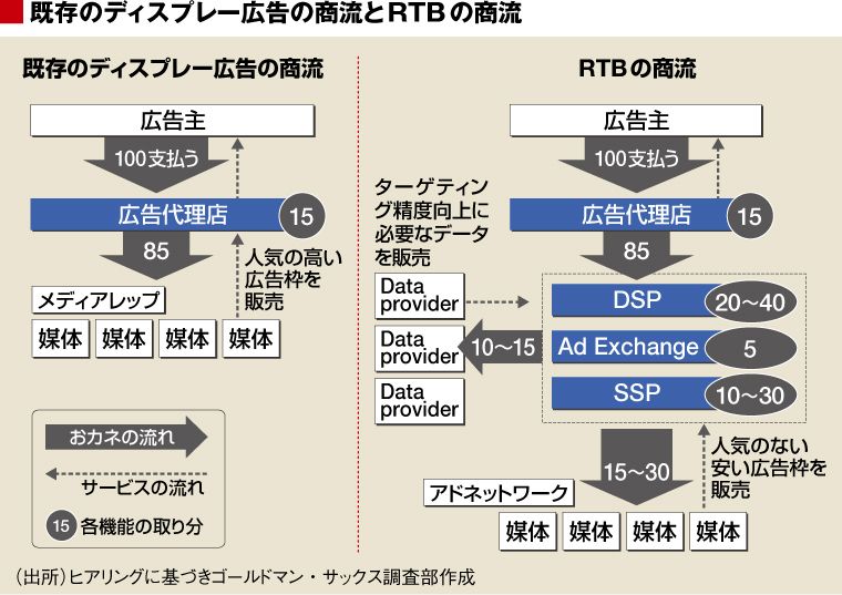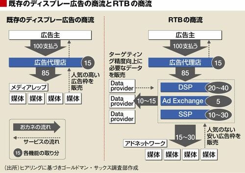 まず、そもそも、RTB広告とは何かを説明しよう。既存のディスプレー広告と、RTB広告の商流には下図のような違いがある。
