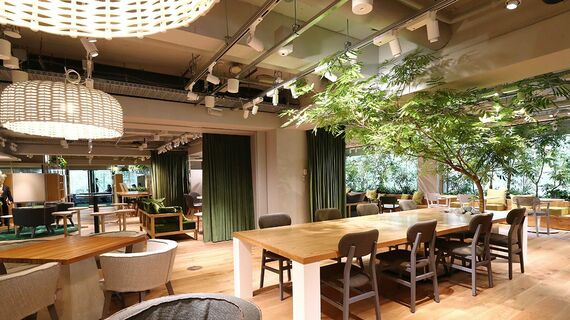 シェアオフィス「point 0 marunouchi」に一歩足を踏み入れると、生い茂った緑が目に飛び込んでくる。小鳥のさえずりが響きわたるオープンなエリアにはチェア席、ソファ席、ハイカウンター席があり、周囲とコミュニケーションを取りながら仕事をしている人の姿がある。