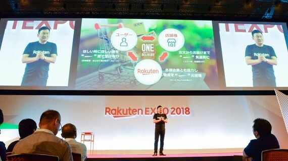 「楽天市場」の出店者に向けた戦略共有会(2018年7月)。独自物流網を拡充する「ワンデリバリー」構想の重要性を訴える楽天の三木谷浩史会長兼社長(撮影:大澤誠)