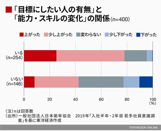 そして、「目標にしたい人の有無」と「能力・スキルの変化」の関係を見ると、目標にしたい人が「いる」人が、能力・スキルが「上がった」割合が圧倒的に高いということが明らかになりました。優秀な上司、先輩がメンター的な存在として、OJTなどで仕事を教えていることも推測できますし、バリバリ活躍する姿に刺激を受けたり、仕事のやり方をまねたりすることで、自然と能力・スキルを高めていることが考えられます。