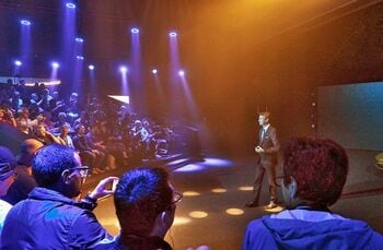 さて、8気筒モデルの説明が終わり、普通ならクルマのまわりになだれ込んでのフォトセッションなのだが、進行から「まだ続きがありますから席を立たないでください」との指示が。すると、座っていた客席がアトラクションさながらに動き始めた。今度は目の前に、裏側に隠れていたもう1台のワールドプレミアカーが現われるという仕掛けであった。