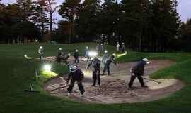 習志野CCはキングコース、クイーンコース2つの18ホールを有するゴルフ場だ。コンポジットコース(複合コース)としてホールをピックアップし、18ホール、パー70、7041ヤードとしてのPGAツアーに対応するコースに仕上げた。コース整備を2時間で完了させてほしいとの要望にも応えるため、芝刈り機などの機材を43台から倍以上の99台に増やした。練習場もクイーンコースの5番、6番ホールを使い、それぞれ350ヤード超えを2カ所用意し、プロの練習環境を整えた。