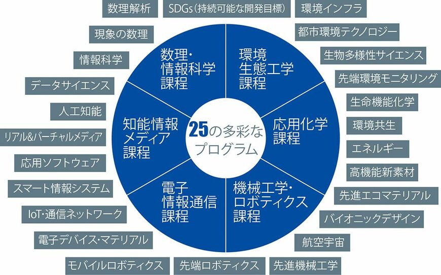 松木平 最も大きな変革は、新たに「課程制」を設けることです。これは日本の理工系学部では初(※)の試みです。6つの課程では、専門分野を主軸に複数の分野を横断して学べるようにします。それに合わせ、どの課程からも自由に履修できる25のプログラムを設置しました。プログラムのテーマは現代の社会的ニーズに即し、人工知能やIoT、データサイエンスなどの情報技術分野やロボティクス、航空宇宙、さらに環境DNAやバイオテクノロジーなどバラエティーに富んでいます。