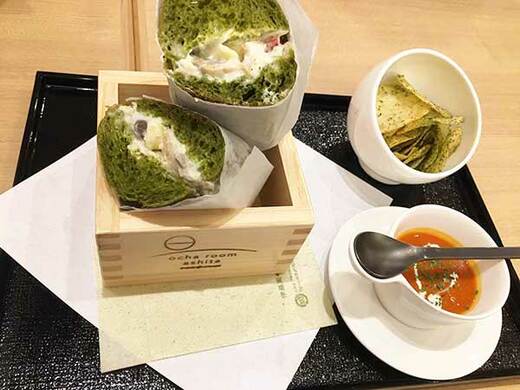 総じて価格は高い。「抹茶『万暦の昔』(菓子付)」(1430円。価格は税込み、以下同)、「日本茶『八女玉露』(温)」(1100円)、「紅茶『京都和紅茶』(温)」(880円)。ほかに「チーズティー」(各935円)、フードでは「抹茶バケットサンド」(1100円)となっている。