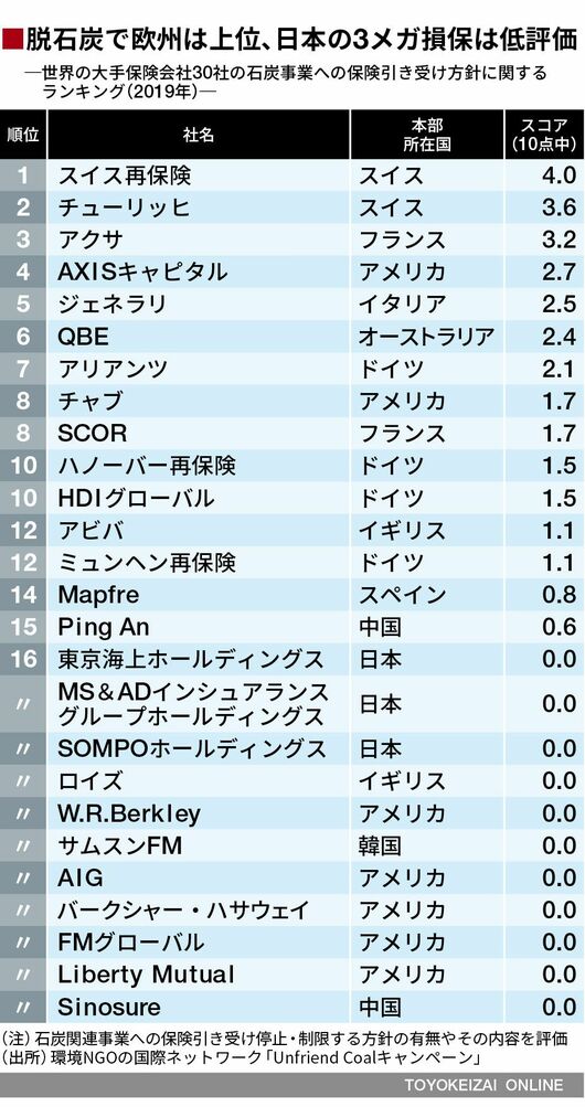 同ランキングは石炭関連事業の保険引き受けを停止したり、制限したりする会社ほどスコアが高く、上位をチューリッヒやアクサなど欧州の大手保険会社が占めた。アメリカやオーストラリアなどの損保も上位の一角に顔をのぞかせた。