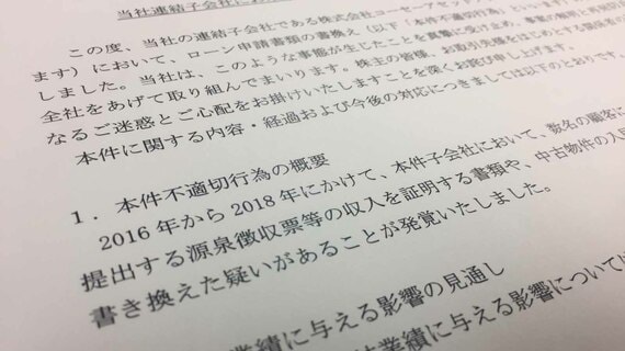 現在判明している情報では、対象物件は福岡県内のマンション5物件で計6620万円。同社によれば、マンション販売子会社「コーセーアセットプラン」が2016年から2018年の間に、銀行へ提出する源泉徴収票などに記載されている収入の額を100万円程度引き上げたり、中古物件の入居者から徴収している賃料の数字を書き換えたりした。12月3日に外部からの通報を受けて発覚したといい、同社は予定していた2020年1月期第3四半期決算の発表を延期した。