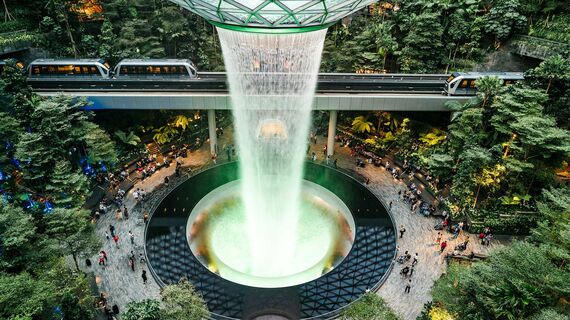 テーマパークでもあり、未来的なドーム型の娯楽施設ともいえる。空港は通常、旅の中間地点だが、チャンギ空港は利用者に滞在してもらおうという珍しい空港だ。