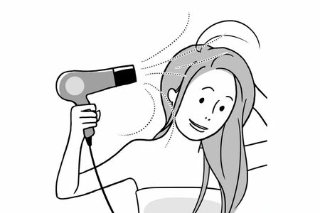 髪の毛をこすらないようタオルで水分をしっかりふき取る。ドライヤーは十分に距離をとり、基本は冷風を使用して温風と併用しながら乾かす。温風を当てすぎると頭皮の乾燥の原因にもなるので注意。