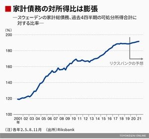 スウェーデンの家計債務は可処分所得対比で見てもその比率が上昇傾向にあり、予測期間中も悪化傾向は続く見通しだ。こうした状況のもとで、住宅価格が下落に転じた場合、家計部門のバランスシート調整を通じて実体経済が長期停滞に追い込まれる懸念は決して小さなものではあるまい。