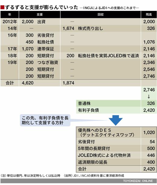 今年3月末時点でJDIの有利子負債のうち1820億円分(連帯保証を含む)はINCJが用立てており、それとは別にINCJはJDIの普通株式として投資残高ベースで326億円(簿価ではなく出資と回収の差額)を保有している。3月末までに法的整理となっていれば、INCJが持つJDI関連の支援残高2146億円(1820億円+326億円)は大半がこげ付いたはず。逆にいえば、最大損失は2146億円でとどまったことになる。