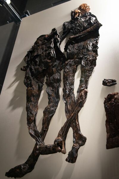 悲劇のベールに包まれているのが2人組の《ウェーリンゲメン》だ。1904年にオランダのウェーリンゲ近郊の泥炭地の湿地で発見された。亡くなったのは紀元前40年頃~後50年頃。骨はほとんどなくなり、皮膚だけの状態になっている。人為的にミイラにされたのではなく、泥炭によって微生物の活動が抑えられ、遺体が自然にミイラ化したと考えられている。酸性の強い泥炭地では骨が溶けて皮膚が残り、アルカリ性が強いと骨が残るそうだ。