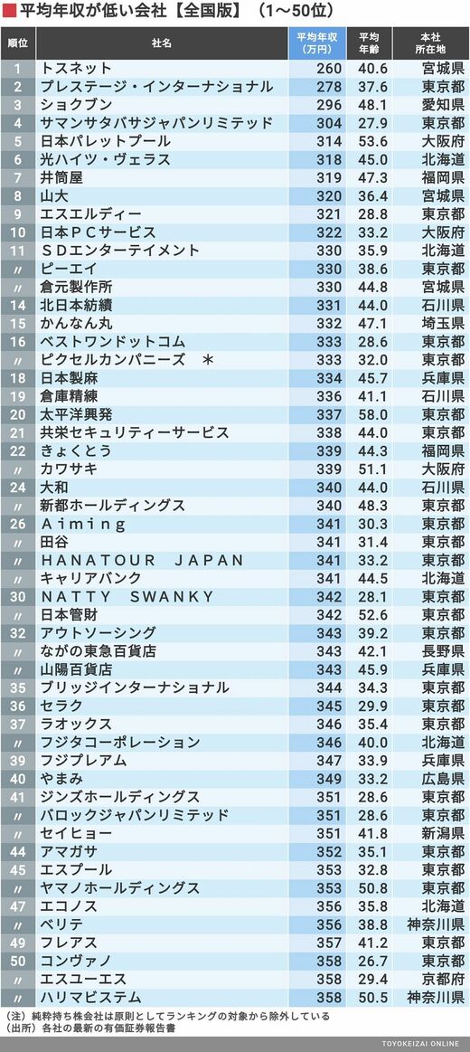 政治・経済・投資 #賃金・生涯給料ランキング 前の記事 次の記事 平均年収「全国ワースト500社」最新ランキング 平均年収400万円未満の会社は156社だった 2分で読める 公開日時:2020/01/17 05:05 東洋経済オンライン編集部 フォロー 1/11 PAGES 2/11 PAGES 次ページが続きます:【次に100位までのランキング】 3/11 PAGES 4/11 PAGES 5/11 PAGES 6/11 PAGES 7/11 PAGES 8/11 PAGES 9/11 PAGES 10/11 PAGES 11/11 PAGES