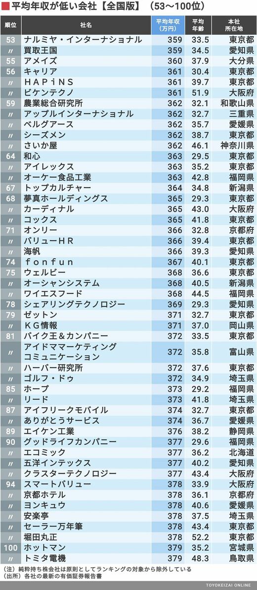 政治・経済・投資 #賃金・生涯給料ランキング 前の記事 次の記事 平均年収「全国ワースト500社」最新ランキング 平均年収400万円未満の会社は156社だった 2分で読める 公開日時:2020/01/17 05:05 東洋経済オンライン編集部 フォロー 1/11 PAGES 2/11 PAGES 3/11 PAGES 次ページが続きます:【続いて101位から150位】 4/11 PAGES 5/11 PAGES 6/11 PAGES 7/11 PAGES 8/11 PAGES 9/11 PAGES 10/11 PAGES 11/11 PAGES