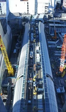 当初、新駅舎の屋根デザインは「門型ラーメン構造」と呼ばれる四角い筒型を想定していた。これならデッキは設置しやすい。ところが、角のある構造物は駅前広場上空で存在感を示し過ぎる。そのため、角をとったアーチ構造が考えられたが、丸みのある屋根にデッキを設置するのは不安定だ。そこで頂部を1点ではなく2点で支えるM型アーチ案を採用し、デザインと強度の双方の課題を解決した。