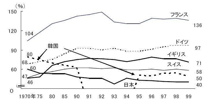 まず1)の食料自給率の低下については、食料自給率を先進国で比較すると、日本だけが異常に低いことが理解できます。