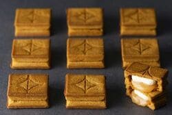 薄焼きのクッキー生地にチョコレートを挟んだスイーツで、弾力のある生地に上下から熱と圧力を加えた「薄焼き製法」によって制作。プレスバターサンドの製法をヒントに開発されたという。