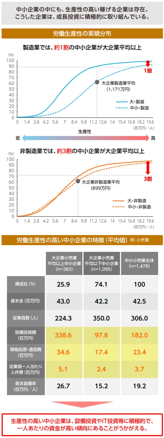 では、どうすれば生産性を上げられるのか。有力な選択肢の1つとなるのが、設備投資だ。図のとおり、中小企業の中にも、生産性の高い“稼げる企業”は存在する。そしてこうした企業に共通するのが、成長投資に積極的に取り組んでいることだ。もちろん業績が上がっているから設備投資を行えるという面もあるのだろうが、いずれにせよ、生産性と設備投資は密接に関係していることがわかる。