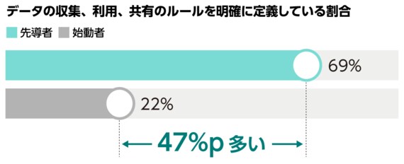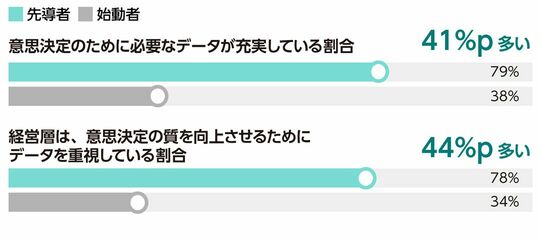 「逆に、始動者クラスターでは、データを信頼する組織文化が育っていません。『意思決定の質を向上させるためにデータを重視している』と回答した始動者は34%。先導者と比べて半分以下です。結果、『意思決定のために必要なデータが充実している』と回答した始動者は38%、先導者は79%と、大きな差がついてしまっています」(岡村氏)