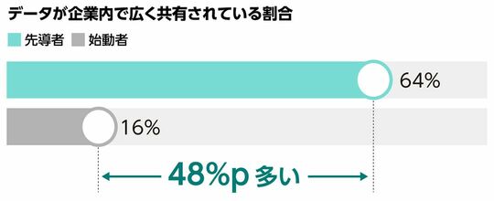 先導者クラスターは、ITの専門家だけでなくすべての社員にデータを共有したうえで、その活用を促進している。「誰もがデータを活用できる状態」を創出してサイロ化を防いだり、社員が必要とする分析スキルやツールの提供を積極的に行ったりすることが、成功への第一歩だといえよう。