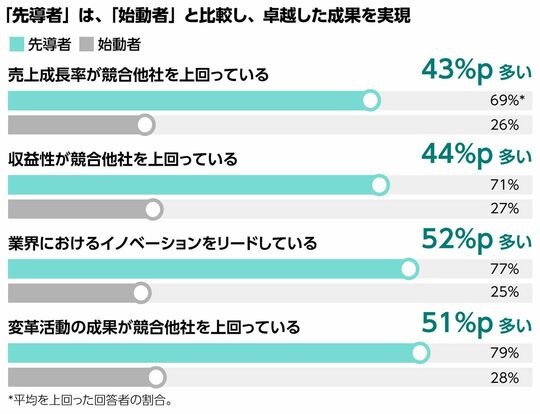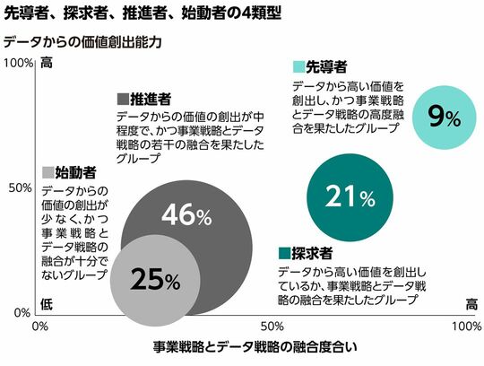 この中で、「事業戦略とデータ戦略の融合度合い」を横軸、「データからの価値創出能力」を縦軸に取り、回答結果から企業を「先導者」「探求者」「推進者」「始動者」の4類型に分類している。例えば両軸ともに高いレベルで実現している「先導者」は、両軸とも低い「始動者」と比べて、事業の財務業績や変革活動の成果において極めて優れたパフォーマンスを実現している。
