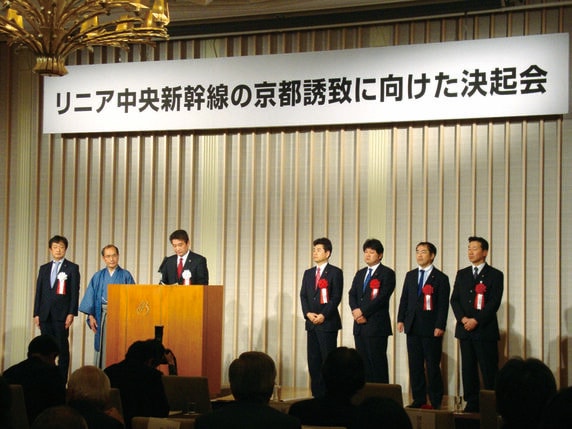 冒頭の1月17日に開催された決起集会は、誘致へのアピールの一環。「京都ルートの場合、奈良ルートよりも建設費は2800億円増えるが、経済効果が40億円増し、利用者や事業者の便益も増える」と、京都側は主張する。