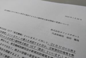 特別決議が必要なことについては、過去のブルドックソース事件の最高裁判例を引用するとともに、「新株予約権の発行は有利発行と同視される」と指摘している。そのうえで臨時総会開催について、文書では「対応方針を早急にご回答願います」と締めくくっている。東芝機械はこの要請にどう対応するのか。頭を悩ませる日々が続きそうだ。