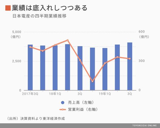 日本電産の2019年4~12月期決算は、売上高が前年同期比3.3%増の1兆1596億円、営業利益は設備投資や買収にかかわる費用がかさみ、同23.9%減の947億円となった。下方修正後の2020年3月期の業績見通しは、売上高1兆5500億円(同5.1%増)、営業利益は1400億円(同7.8%増)を見込んでいる。