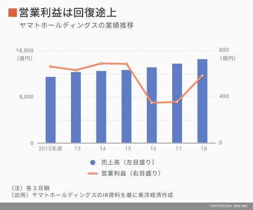 ヤマトは2020年3月期、宅配便の取扱量の低迷などを理由に2度の業績下方修正を強いられている。通期の営業利益で720億円(前期比23・4%増)を掲げていたが、2019年10月に620億円(同6・3%増)へ引き下げた。しかし、2019年4月~12月までの宅配便の取扱量は前年同月比で0.7%減と足元では厳しい状況が続いている。営業利益は目標に届かず、2019年3月期実績の583億円を下回るおそれもある。
