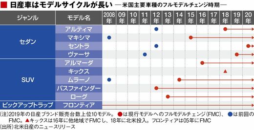 フルモデルチェンジまでの期間は、国・地域や車種にもよるが、通常は5~6年程度。これに対し、「フロンティア」は2005年を最後に全面改良しておらず、現行のSUV「パスファインダー」は8年が経過した。2019~2020年に立て続けに全面改良した小型セダンの「ヴァーサ」「セントラ」も、前回から8年を要した。
