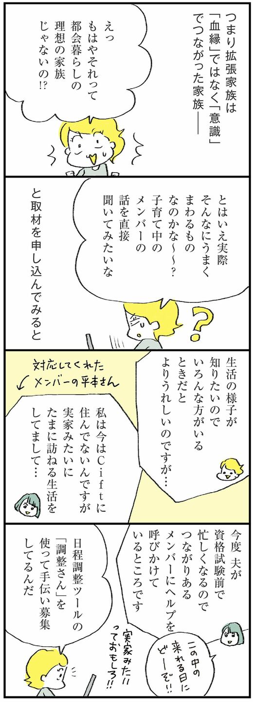 ライフ #ほしいのは「つかれない家族」 前の記事 次の記事 「うちの家族限界!」を突破する1つのアイデア 家族の範囲を"拡張"して暮らす人々の視点 3分で読める 公開日時:2020/02/21 05:10 ハラユキ イラストレーター、コミックエッセイスト フォロー 1/8 PAGES 2/8 PAGES 3/8 PAGES 4/8 PAGES 5/8 PAGES 6/8 PAGES 取材を申し込んでみると… 次ページが続きます:【どんなふうに調整ツールを使っているの?】 7/8 PAGES 8/8 PAGES