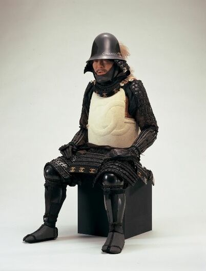 黒光りのする鎧兜に身を包んだ戦国時代の武将が座っている。しかし、目を凝らすと兜にCHANELの文字。胴の白い部分にもシャネルのマークが家紋としてあしらわれている。彼は紗練家(しゃねる家)の武将なのだ。