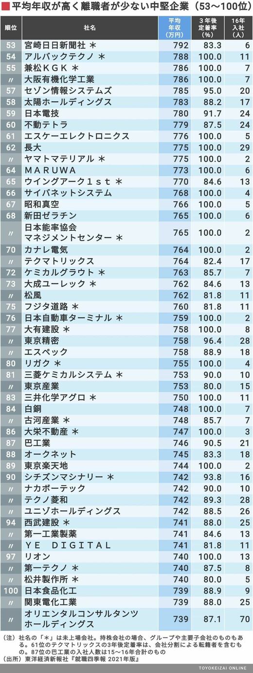 キャリア・教育 #就職四季報プラスワン 前の記事 次の記事 「給料が高くて社員が辞めない中堅企業」169社 平均年収700万以上で新卒定着率8割以上対象 4分で読める 公開日時:2020/02/22 06:00 小村 圭 東洋経済データ事業局 フォロー 1/5 PAGES 2/5 PAGES 3/5 PAGES 4/5 PAGES 次ページが続きます:【平均年収が高く離職者が少ない中堅企業103~162位】 5/5 PAGES