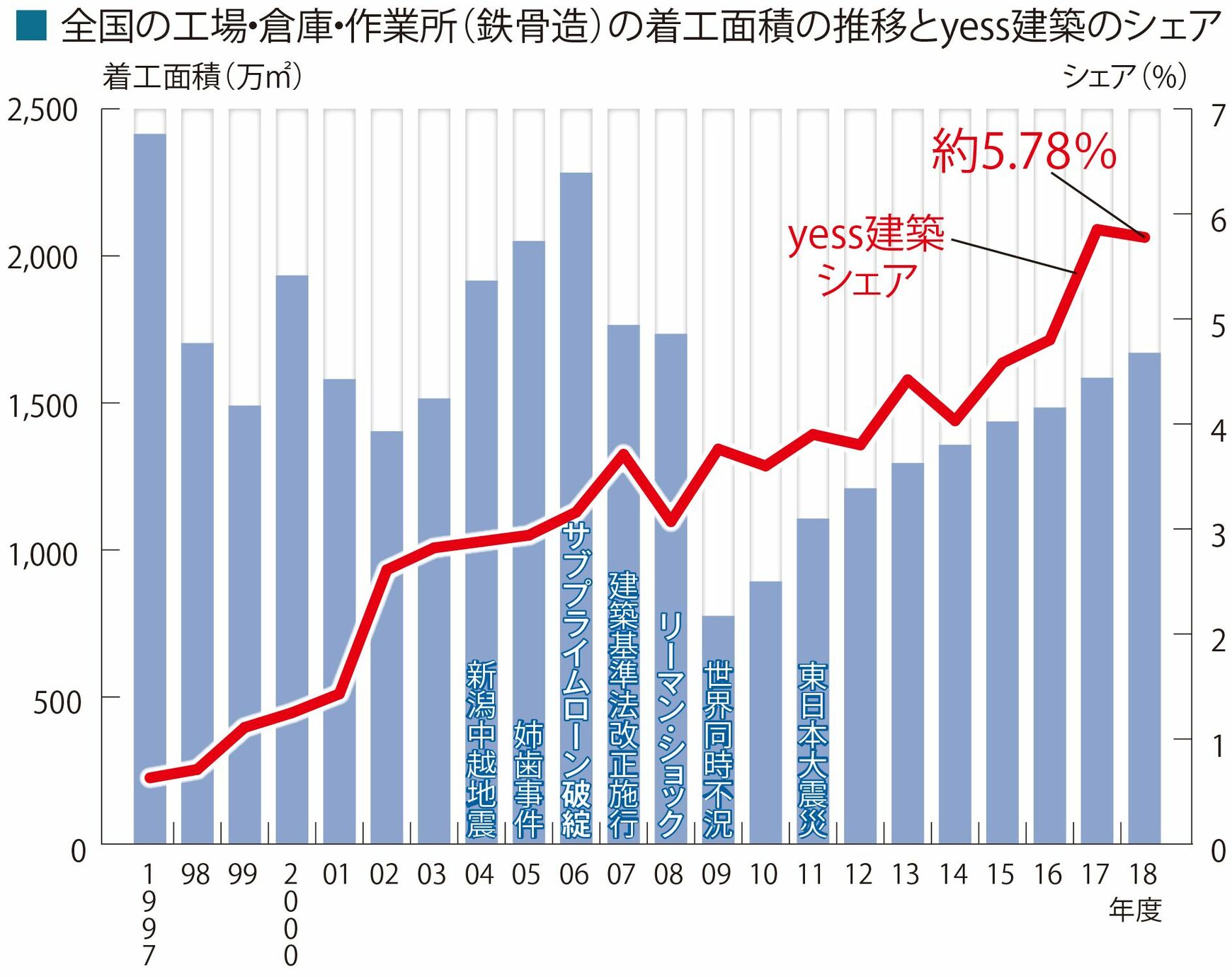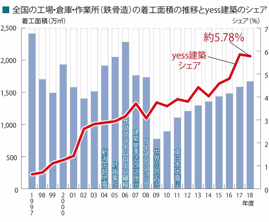 「yess建築」の受注実績だけでなく、全国の着工面積に占める「yess建築」のシェアも実勢を伸ばしている