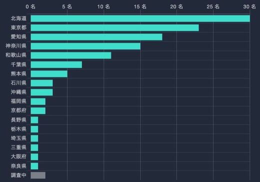 都道府県別の感染者数を見ると、北海道が30名と最も多く、東京都や愛知県がそれに続く。