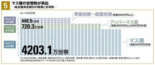 では、多くの人は実際、どの程度の資産を保有しているのか。野村総合研究所が、保有資産から負債を差し引いた純金融資産において、3000万円未満(マス層)、3000万~5000万円(アッパーマス層)、5000万円以上(準富裕層~)に分類したところ、世帯数は図のような分布となった。