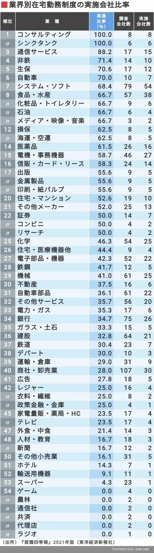 今回の調査結果では、1303社中550社が在宅勤務を導入していた。割合にすると42%になる。下表の通り、業種別の採用社の割合をランキング形式で掲載したが、コンサルティング業(8社)、シンクタンク業(6社)は在宅勤務の導入が100%になっている。それ以外で採用社の割合が高いのは、通信サービス業(88%)、非鉄業(71%)、生命保険業、自動車業(各70%)などだ。