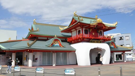 真っ赤な柱と緑の屋根、黄金に輝く竜やイルカの像……。2月末、湘南の景勝地・江の島を望む海岸近くに「竜宮城」が姿を現した。小田急電鉄江ノ島線の終点、片瀬江ノ島駅の新駅舎だ。