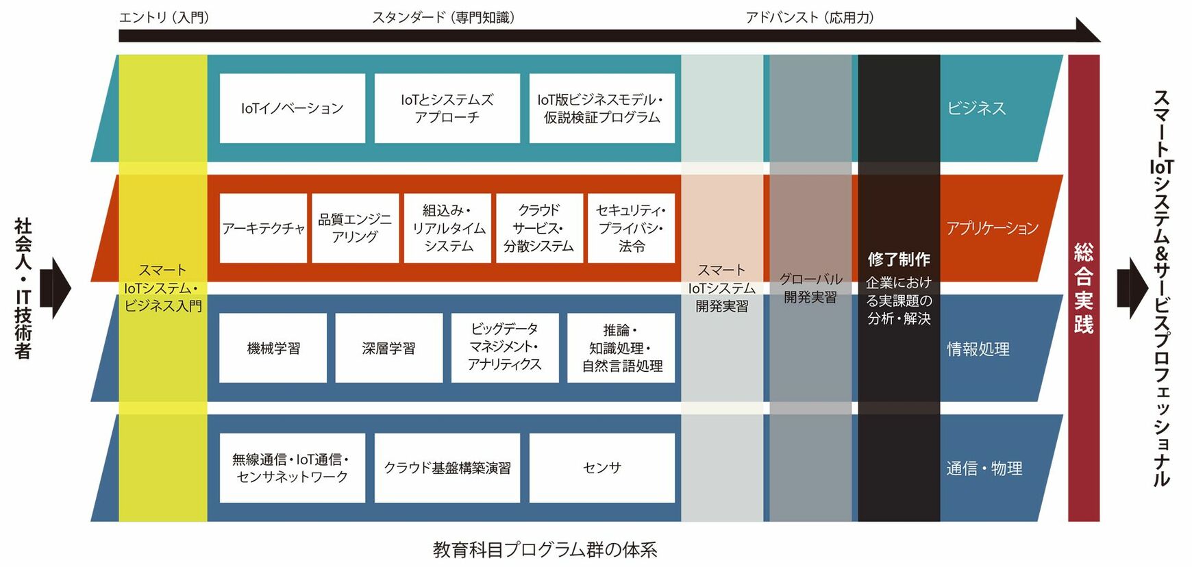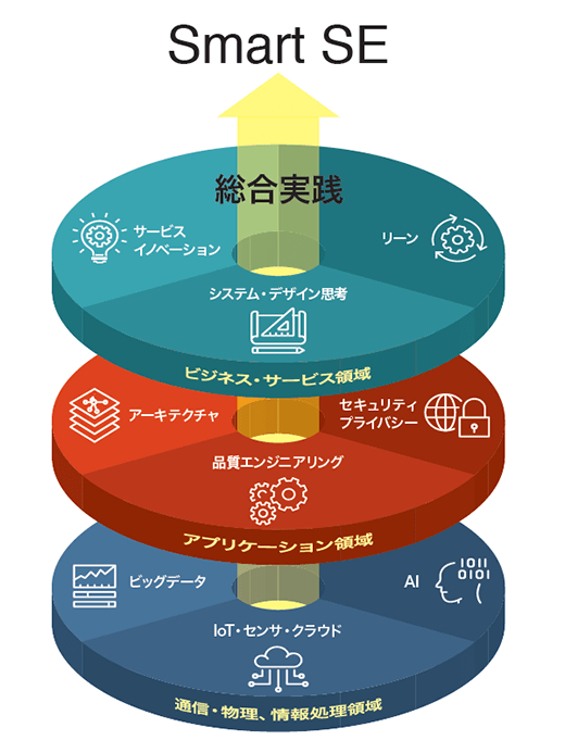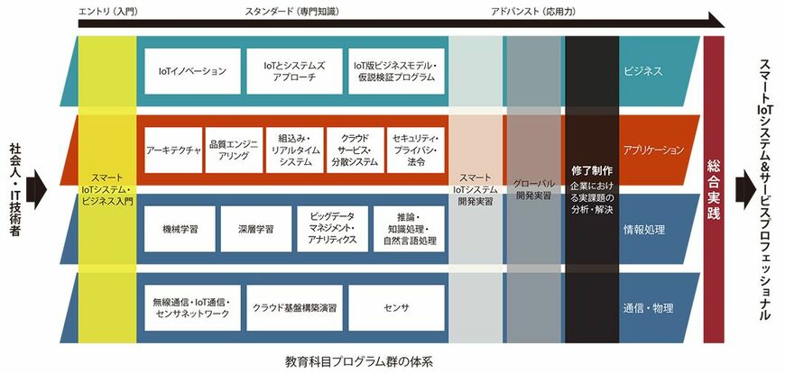 「個々の要素技術だけでなく、大切なのは、これらの技術を結び付けてビジネスを生み出すことです。『スマートエスイー』では、センサー、ネットワーク、クラウドなどの『通信・物理、情報処理領域』に加え、『アプリケーション領域』、さらには『ビジネス・サービス領域』までを貫く、総合実践的な講義を提供します」(鷲崎氏)。まさに、新たな価値創造を推進できる人材を育成しようとしているわけだ。